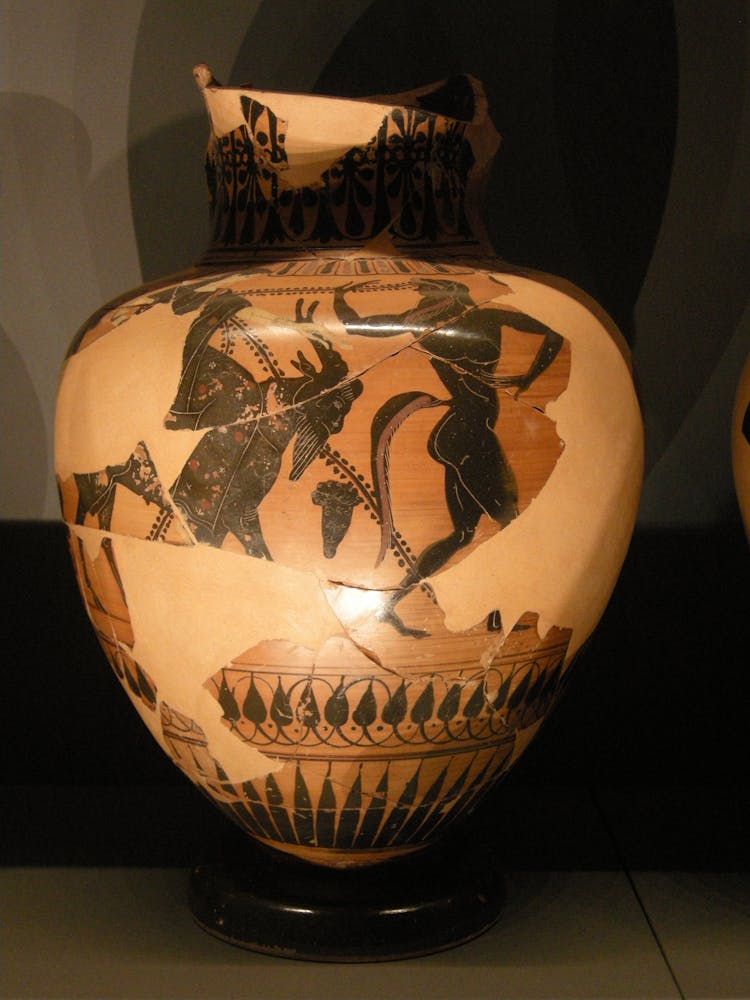 Anfora attica frammentaria a collo distino, decorata con scene del ciclo dionisiaco su entrambi i latti. Sul lato B si riconoscono una menade su un caprone antropomorfo e un satiro. Il vaso risale alla fine del VI secolo a.C. e faceva parte della prestigiosa collezione privata del marchese Bonaventura Chigi Zondadari.