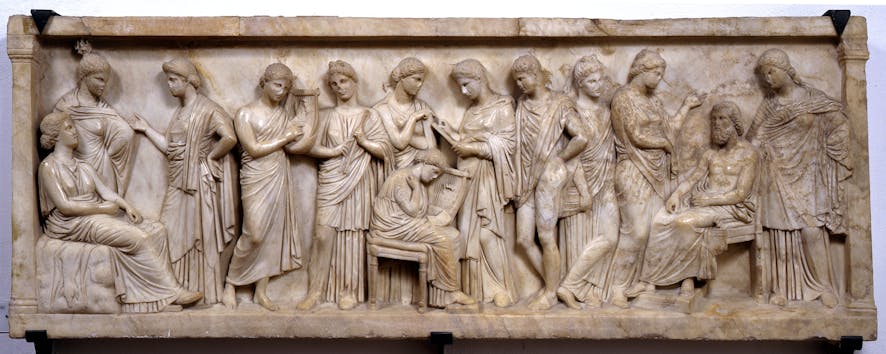 Raffinato rilievo marmoreo, probabile fronte di un piccolo sarcofago, che presenta tredici figure ispirate a modelli greci del IV secolo a.C. Secondo una recente interpretazione, la scena raffigurerebbe l’accoglienza della poetessa Saffo (la figura seduta al centro) sul monte Elicona, circondata dalle muse e accompagnata dalle figure di Ermes e Orfeo con la cetra. Il pezzo conserva l’armonia delle proporzioni classiche.